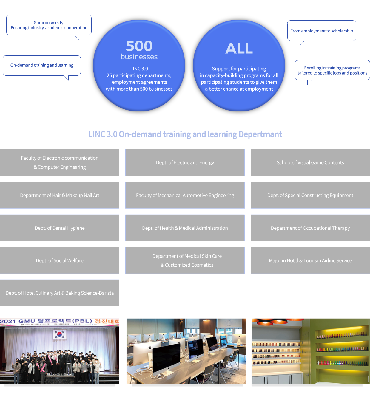 LINC 3.0 is a project in which colleges upgrade their practical and on-site training system on par with industry-wide demands and needs expected in future society, and strengthen their support to create value for corporations with learning programs linked with employment opportunities at corporations in the real world.