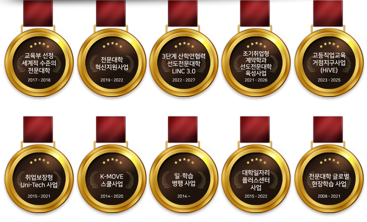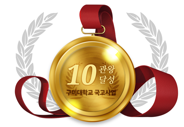 구미대학교는 올해까지 국고사업 10관왕을 달성하였습니다.구미대학교가 땀으로 이루어낸 성과들입니다.