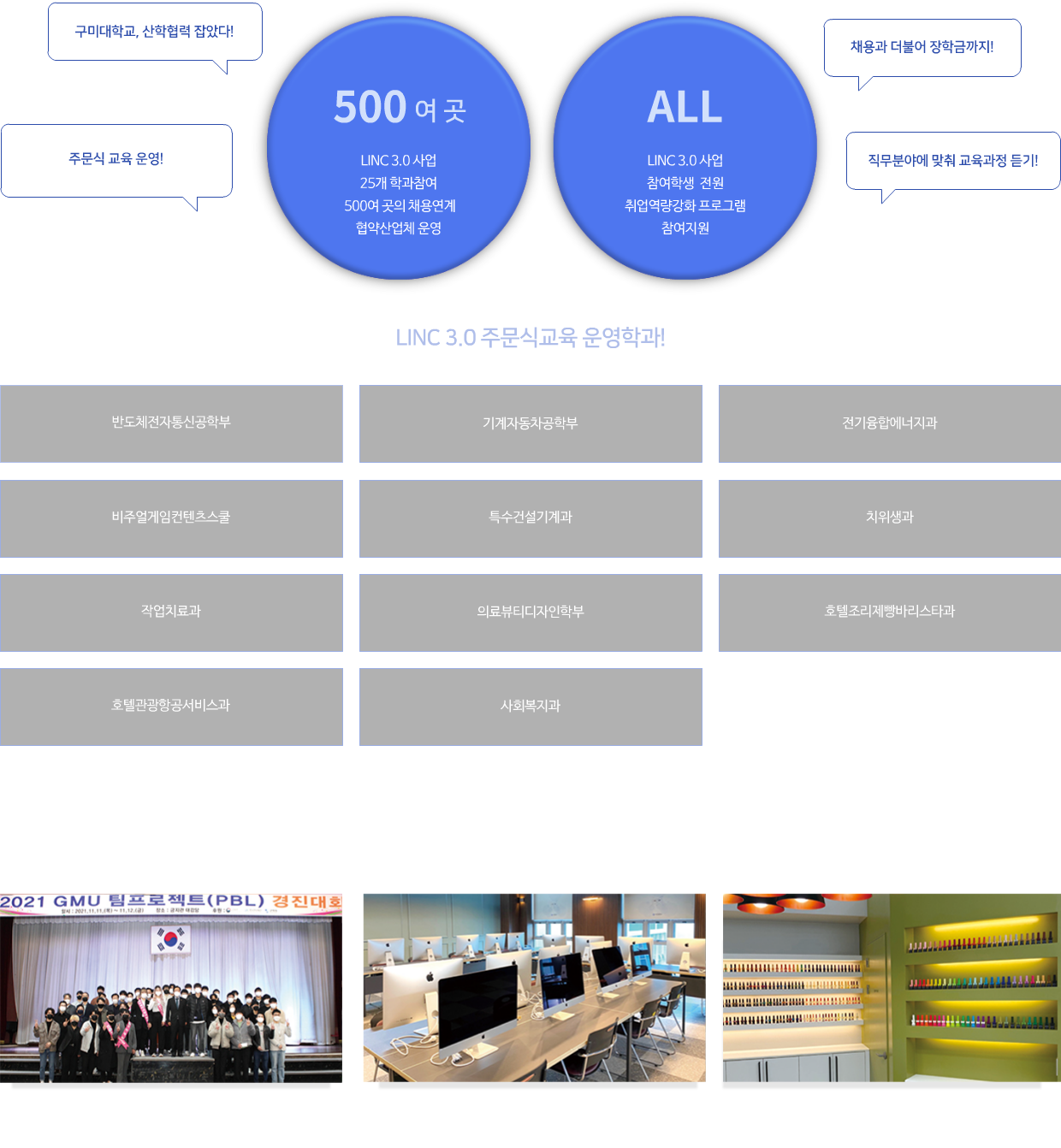 LINC 3.0 사업이란 전문대학이 산업계 및 미래사회 수요에 부합하는 현장 실무형 인재 양성 체계를 고도화하고 기업가치 창출 지원을 강화하여 산업체 채용과 연계하는 교육과정을 지원하는 사업을 말합니다.